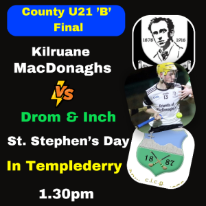 We play a very formidable Drom & Inch side in the County final on St. Stephen’s Day, in Templederry, at 1.30pm. It will take a mammoth effort by the team to overcome the Mid representatives, so the club is asking for a massive show of support for the lads.